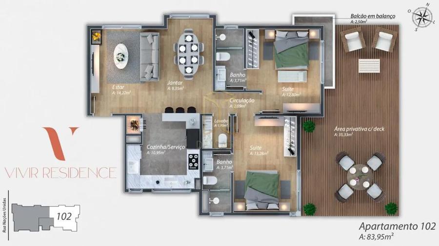 Vivir Residence, localizado no Bairro Bavária, Gramado/RS. Há poucos minutos Centro Gramado. Residencial inspirado no design de mansões americanas mantendo o charme e estilo da Serra Gaúcha. Apartamento 2 dormitórios suítes, cozinha com área de serviço, churrasqueira, lavabo, sala de estar e jantar, deck privativo, 1 vaga de garagem.